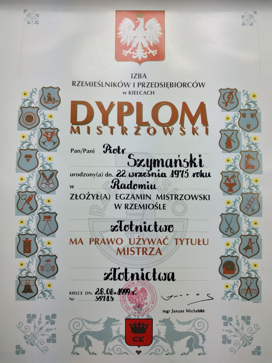Szanowni Państwo, swoją przygodę ze złotnictwem zacząłem jako uczeń.Po kilku latach praktyki otrzymałem świadectwo czeladnicze w rzemiośle złotnictwo.Następnie uzyskałem tytuł mistrza złotnictwa wraz z kwalifikacją pedagogiczną (szkolenie uczniów). Działalność Prowadzona jest od 01.06.2005 r. polega na : sprzedaż biżuterii ze złota i srebra, złota z kamieniami szlachetnymi. Wszystkie nasze produkty wykonane są w całości z 14-nasto karatowego złota. Główną misją firmy jest zapewnienie najwyższej jakości usług ,przekazywanie rzetelnej i fachowej informacji klientowi by mógł dokonać najlepszego wyboru.